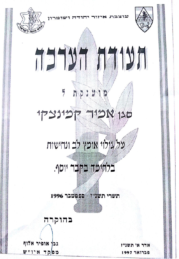 תעודת הערכה מוענקת ל- סגן אמיר קמינצקי על גילוי אומץ לב ונחישות בלחימה בקבר יוסף תשרי תשנ"ז – ספטמבר 1996 בהוקרה גבי אופיר – אלוף, מפקד איו"ש אדר א' תשנ"ז פברואר 1997